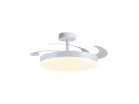 Motor DC. 3 aspas. Diámetro Abierto: 107 / cerado 50 cm. Material acrílico blanco. Color Palas: Transparente. Motor DC 30w. Luz LED 45w. Regulable en tono de luz 3000K-6500K e intensidad. Mando a distancia. Con memoria, modo noche y modo brisa. 6 velocidades. Función verano/invierno. 2 largos de barra incluidos para montar según la altura del techo. Largo total 27/37cm.