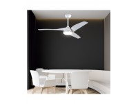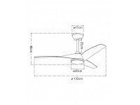 Ventilador de 132cm de diámetro y altura con dos largos de barra 34/48cm. Metal y acrílico. Motor DC silencioso con 6 velocidades+modo brisa. Modo verano/invierno. Mando con temporizador. Luz LED 18w regulable en tono e intensidad. Con memoria de luz.