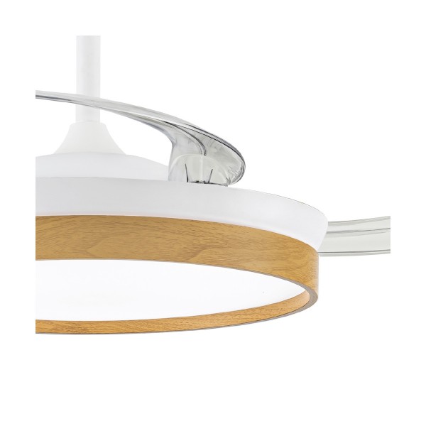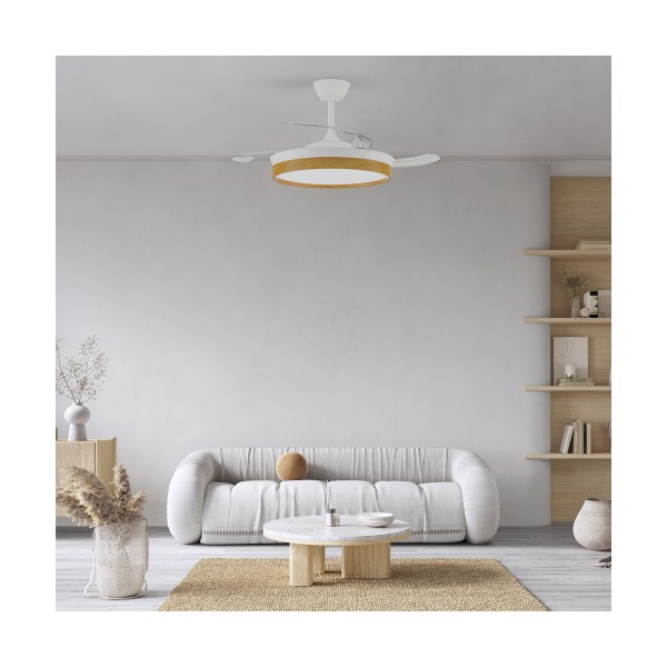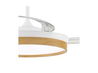 Ventilador con luz led fabricado en ABS y acrílico. 3 aspas. Motor DC 29w con 6 velocidades y modo brisa. Mando a distancia con temporizador y funcion invierno-verano. Garantía motor 8 años. Mide 106cm y 48.5cm cerrado y 34/44cm de largo (viene con largos de barra). Led CCT regulabe en tono e intensidad con hasta 4400lm 45w